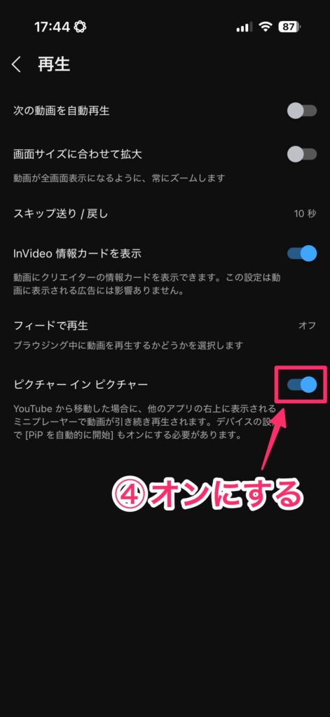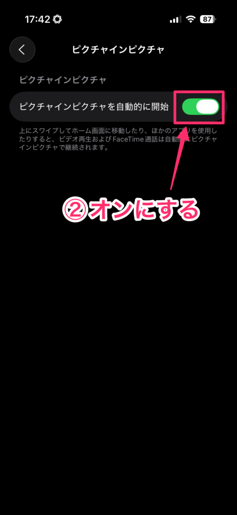 アプリによっては、ピクチャインピクチャを使うための設定が用意されています。