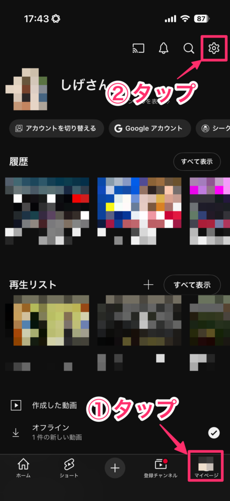 まず、アプリの「マイページ」タブを開いて、歯車アイコンをタップします。設定画面が表示されるので「再生」を開き、「ピクチャーインピクチャー」をオンにします。