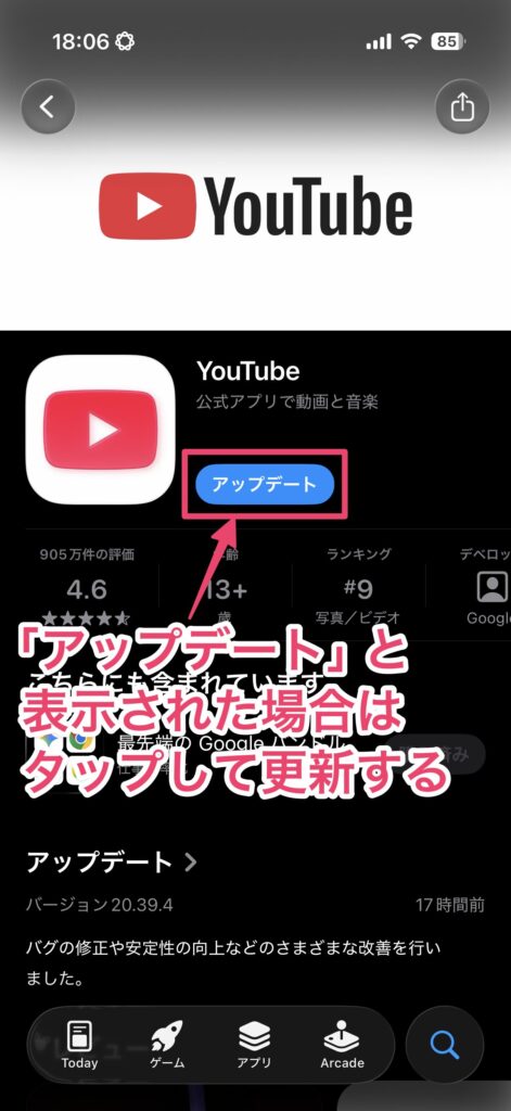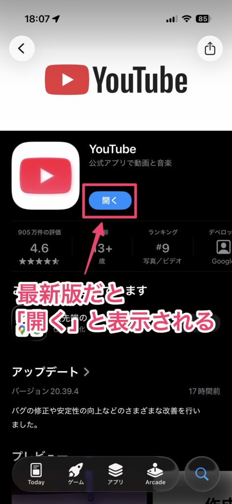 AppStoreで該当アプリを開き、最新版に更新されている確認してください。最新版でない場合は、「アップデート」と表示されているはずなので、ここをタップすれば最新版に更新できます。