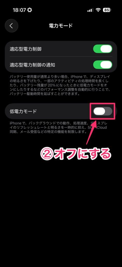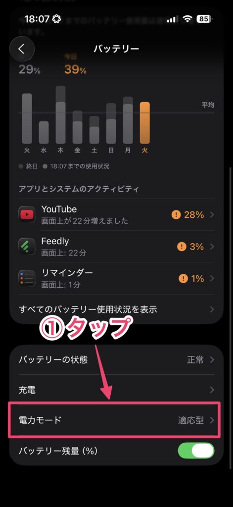 設定アプリで「バッテリー」を開きます。その中の「電力モード」をタップし、「低電力モード」がオフになっているか確認します。