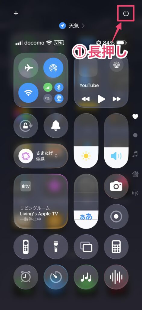 ちなみに再起動する最も簡単な方法は、コントロールセンターを開き、右上の電源アイコンを長押しします。電源オフの画面が表示されるので、スライドすればOKです。