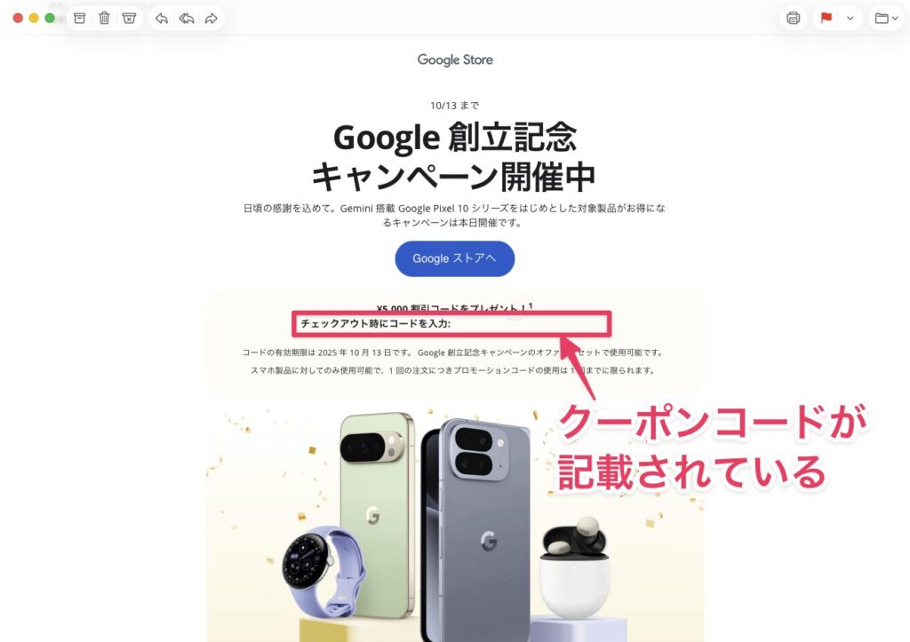 9月21日までにGoogleストアのメール配信に登録している方、またはゲームの参加時に登録に同意した方全員に、対象製品の購入時に利用できる5,000円分のプロモーションコードがメールで届いています。