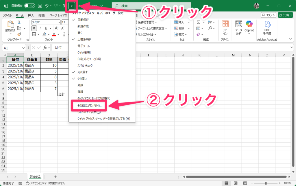 登録するには、Excelウィンドウ左上のクイックアクセスツールバー右端にある「▼」をクリックし、「その他のコマンド」を選択します。
