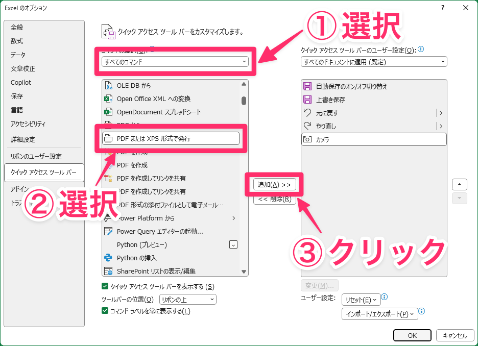 「コマンドの選択」で「すべてのコマンド」を選択します。左側の一覧から「PDFまたはXPS形式で発行」を探して選択し、「追加」ボタンをクリックします。
