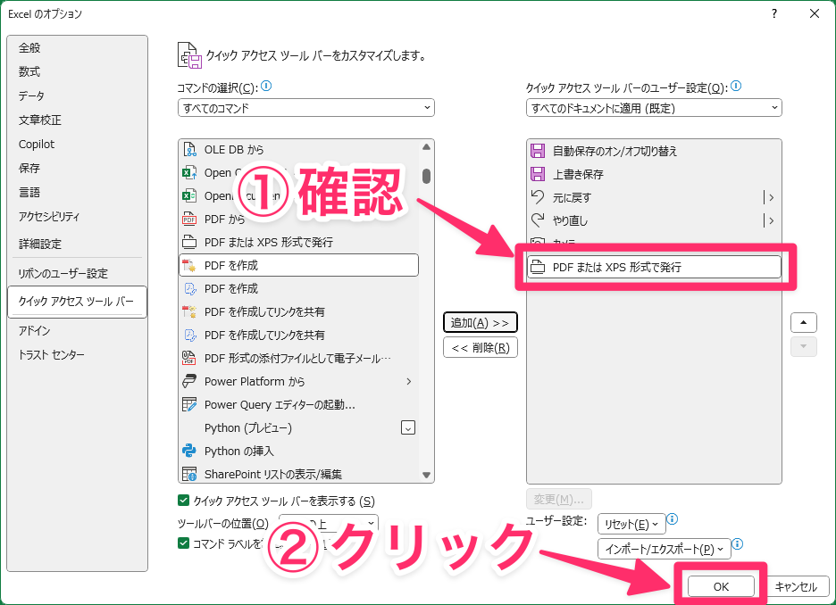 右側の一覧に「PDFまたはXPS形式で発行」が追加できたことを確認したら、「OK」をクリックします。