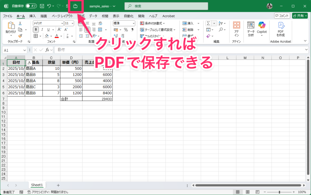 これで、上部のツールバーにPDFで保存するアイコンが表示されます。これをクリックすれば、いつでも即座にPDF保存できるようになります。