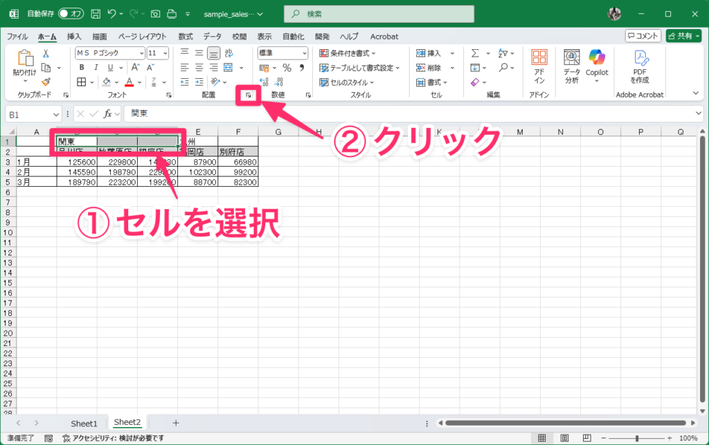 セルを結合せずに中央揃えするには、中央揃えにしたいセル範囲を選択します。「ホーム」タブを開き、「配置」グループの右下にある矢印マークをクリックします。
