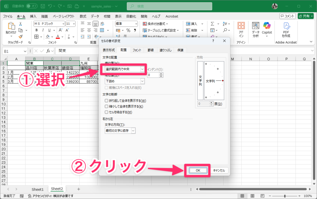 セルの書式設定ダイアログが表示されるので、「横位置」で「選択範囲内で中央」を選択し、「OK」をクリックします。