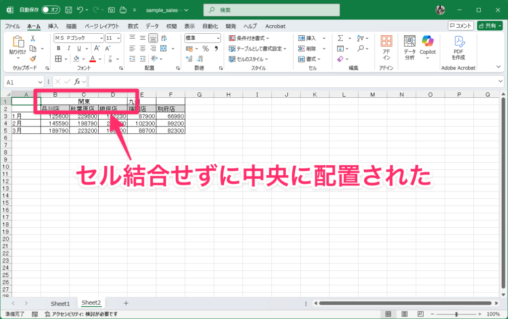 2:「セルの結合」を使わずに中央揃え