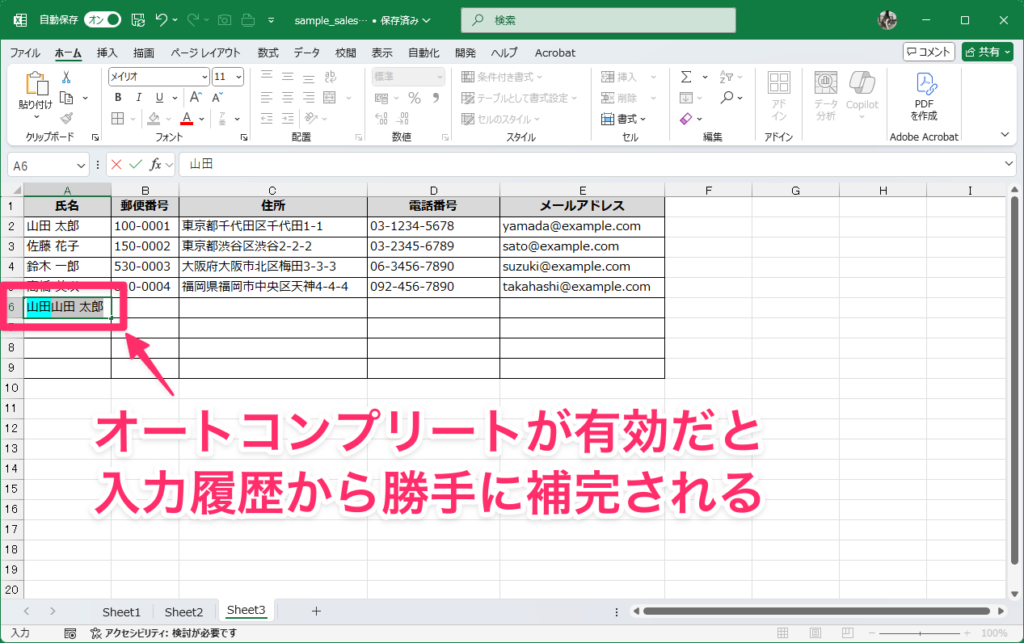 特に似たようなデータが多い表では、勝手に補完されて間違った入力をしてしまうことも。そんなときはオフにしてしまいましょう。