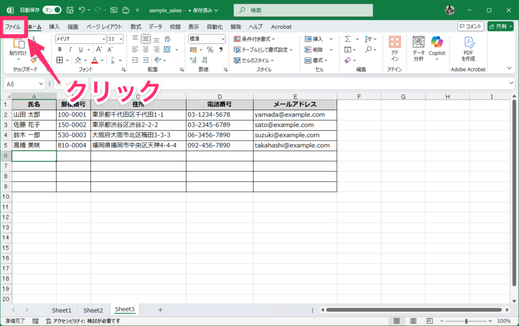 まず、「ファイル」をクリックします。