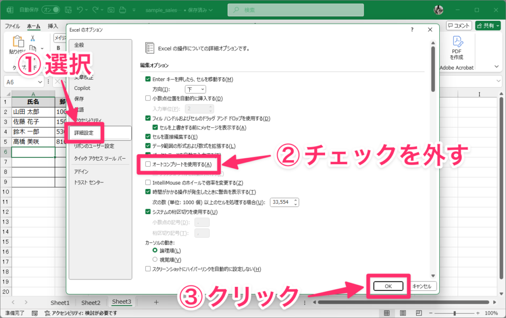 Excelのオプションダイアログが表示されるので、左側のメニューで「詳細設定」を選択し、「セルに入力するときに候補を表示する」のチェックを外します。「OK」をクリックすれば、オートコンプリートがオフになります。