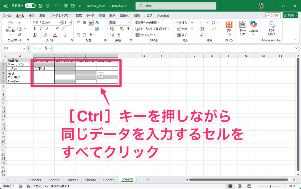 前述したテクニックとは少し違い、離れた複数のセルに同じ内容を一気に入力したいときもありますよね。そんなときは範囲選択→データ入力→Ctrl