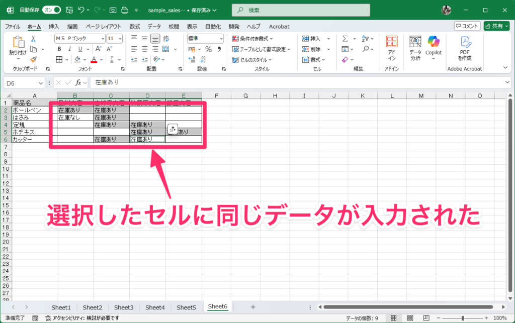 これで選択したすべてのセルに同じデータが入力されます。