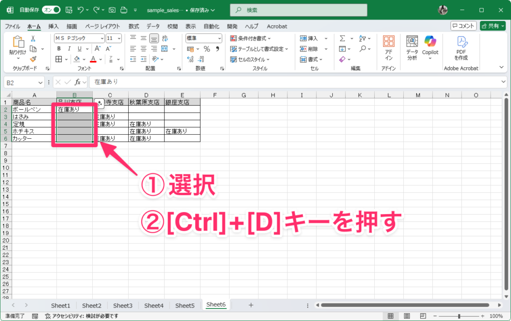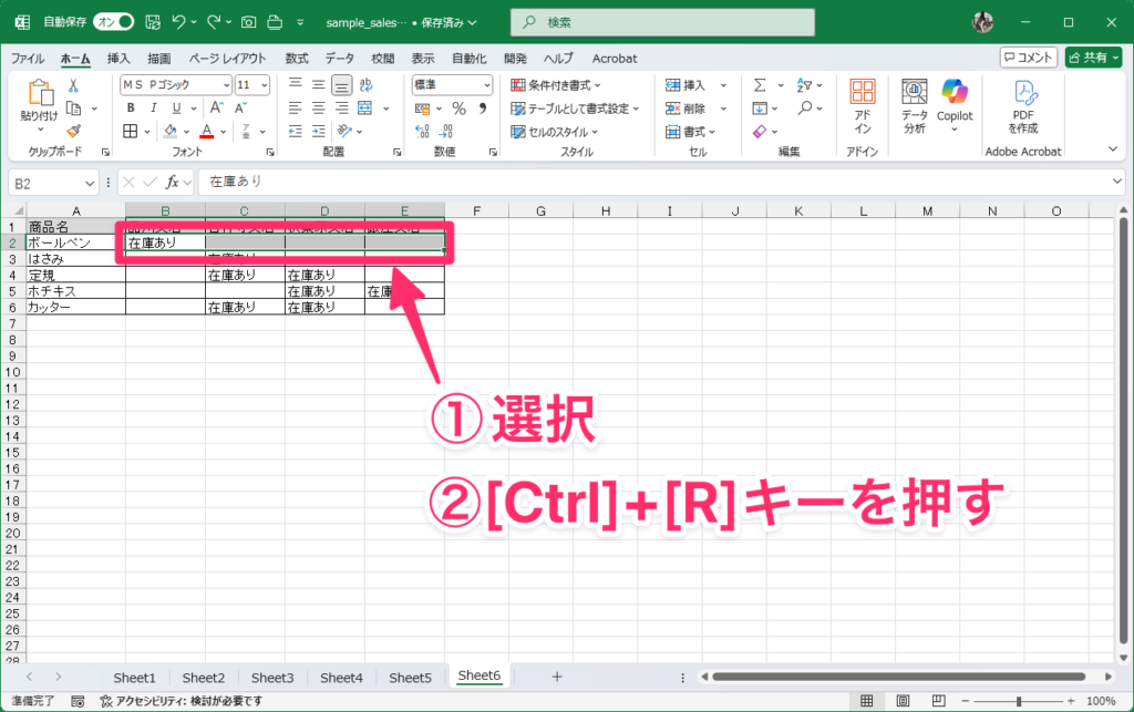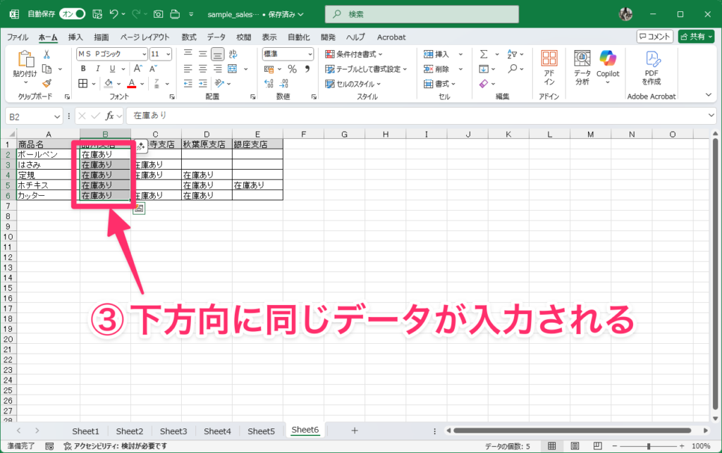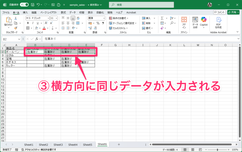 7:右方向または下方向に同じデータを一括入力