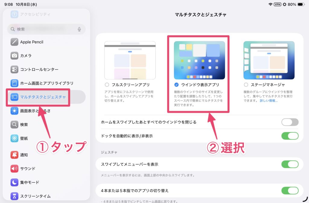 マルチタスクを利用するには、設定アプリで変更します。設定アプリの「マルチタスクとジェスチャ」を開き、「ウィンドウ表示アプリ」を選択します。