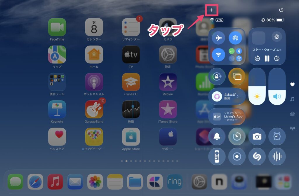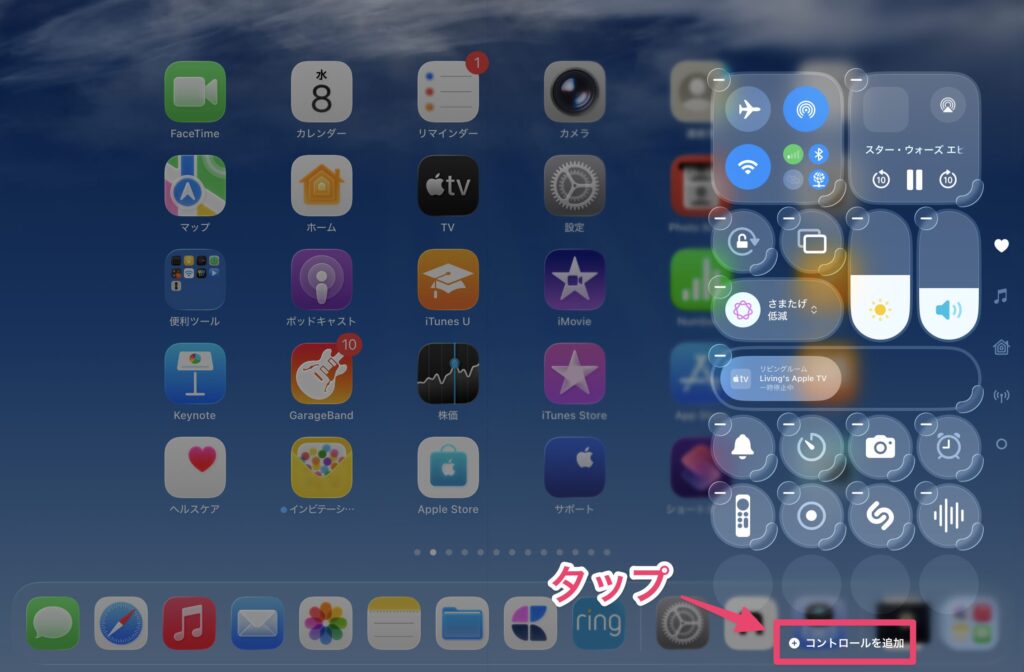 コントロールセンターを開いたら、左上の「+」をタップします。