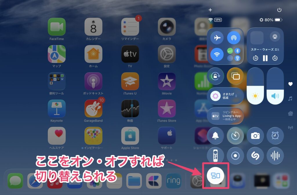 設定アプリでウィンドウ操作と全画面表示を切り替えられますが、毎回設定アプリを開くのは面倒です。そこで、コントロールセンターで切り替えられるようにしておきましょう。