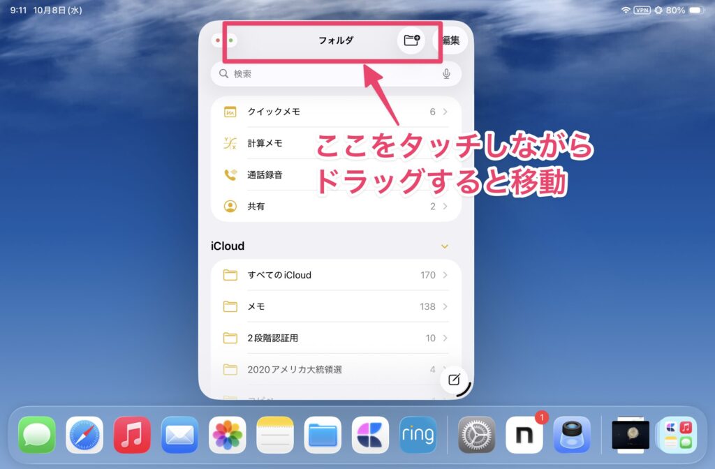 ウィンドウを移動するときは、ウィンドウの上部をドラッグします。これで好きな場所に移動できます。ただ、画面にタッチしてすぐにドラッグすると移動しないことがあるので、タッチして一瞬間を置いてからドラッグするといいでしょう。
