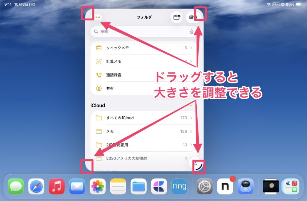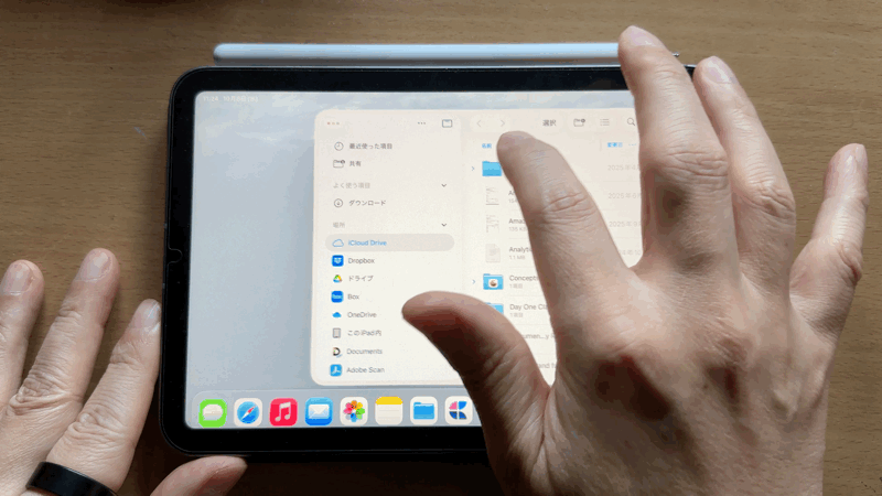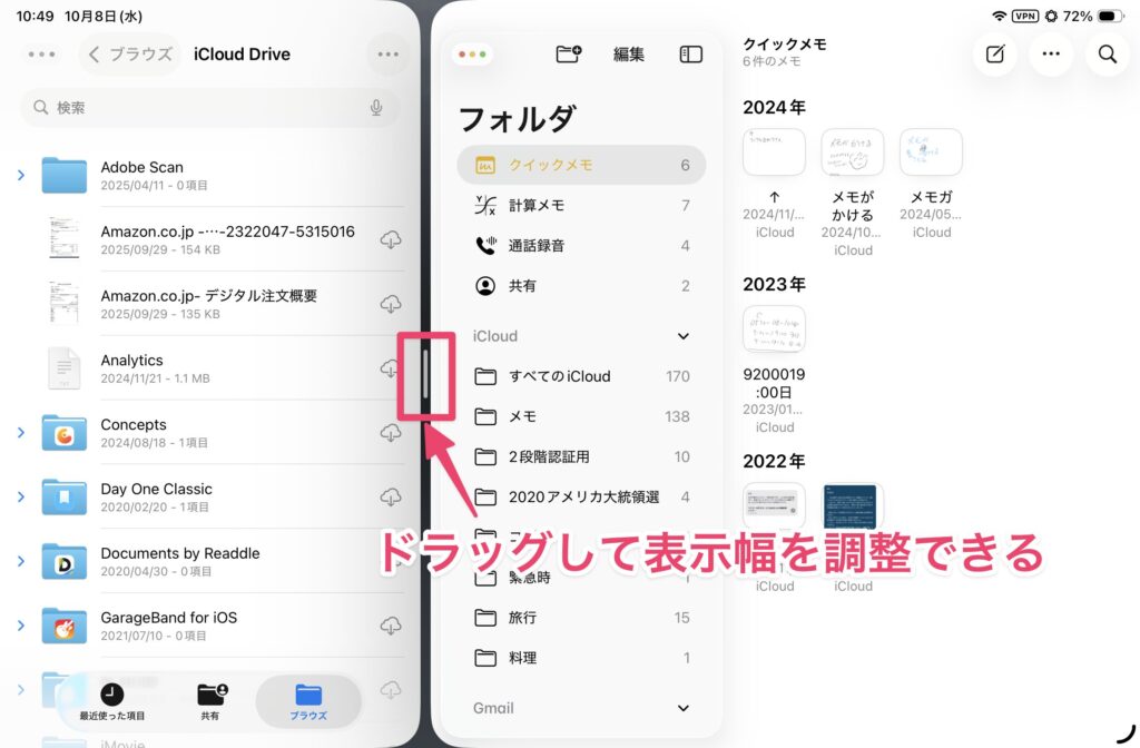 ちなみにウィンドウの境界線にはハンドルが表示されており、ここをドラッグすれば表示幅を調整できます。これも以前のSplitViewに似た感じの操作感ですね。ただし、SplitViewの場合、ハンドルを左右いずれかの端までドラッグすると、そちら側のウィンドウが閉じましたが、iPadOS 26ではこの操作はできません。ウィンドウを閉じる場合は、前述したウィンドウ最小化の操作をしてください。