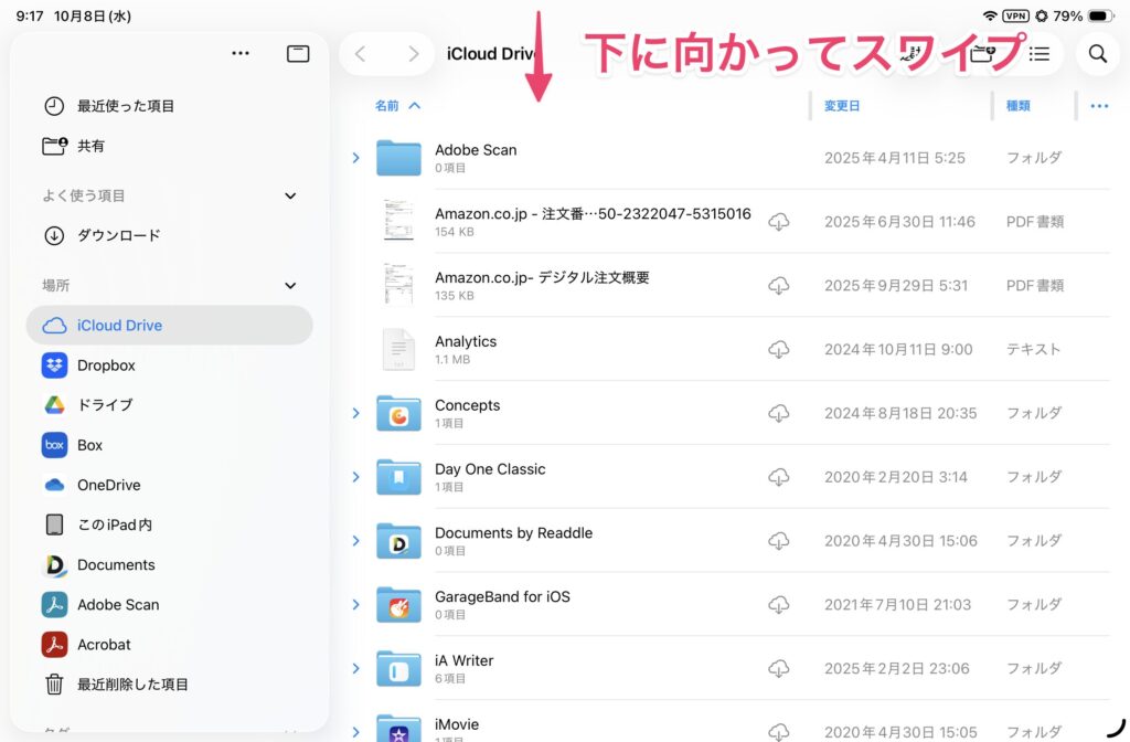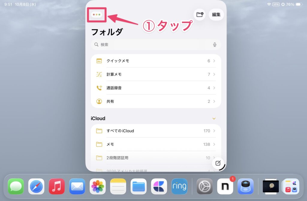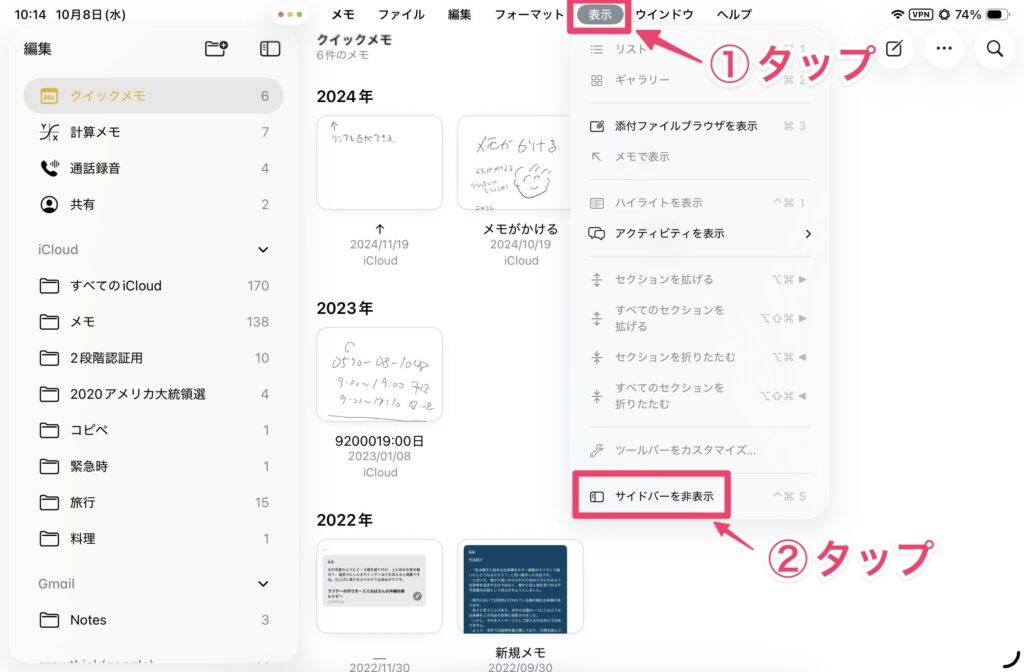サイドバーの表示と非表示を切り替えるには、「表示」→「サイドバーを非表示(表示)」をタップします。