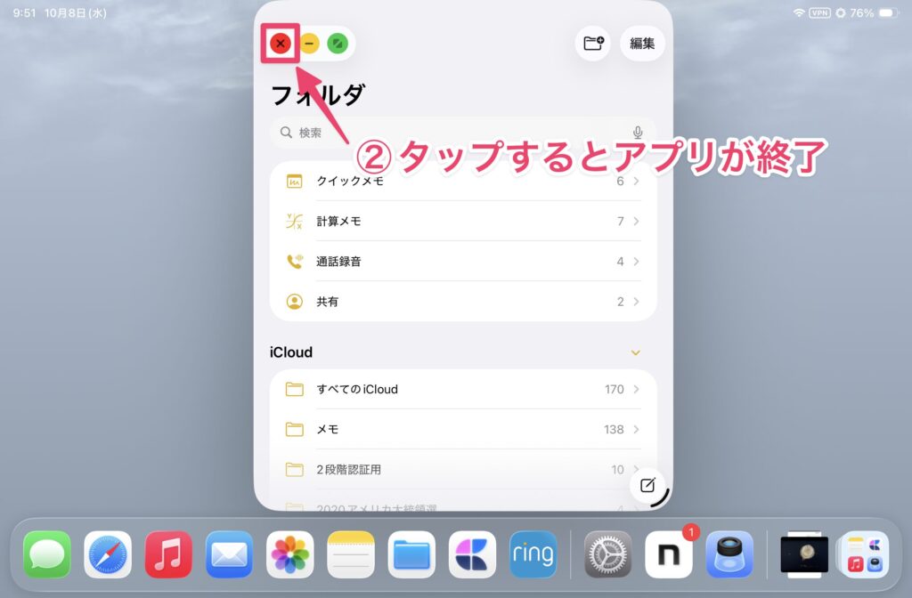 アプリを終了する場合は、ウィンドウの左上にある信号機アイコンをタップします。表示された信号機アイコンの中から赤アイコンをタップするとアプリが終了します。