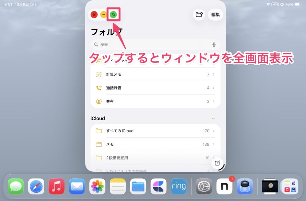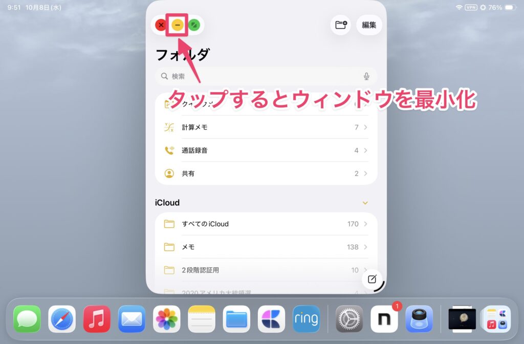 ウィンドウを最小化するには、信号機アイコンを表示して、黄色のアイコンをタップします。これでウィンドウはDockに収納されます。