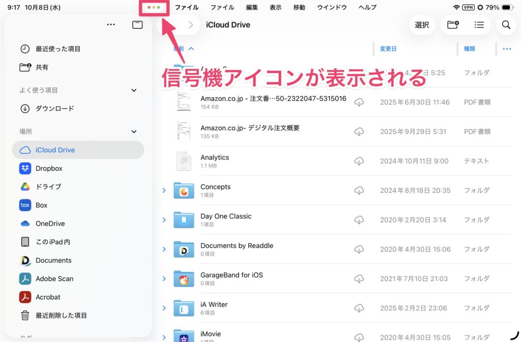 ウィンドウを全画面表示している場合は、信号機アイコンが表示されていません。この場合は、画面上端から下に向かってスワイプします。