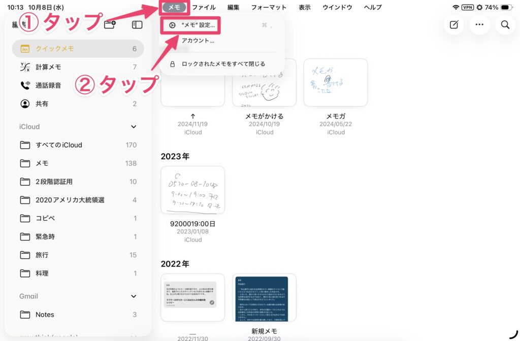 メニューバーを表示したら、「ファイル」→「(アプリ名)設定」をタップします。これで、アプリの設定が表示されます。