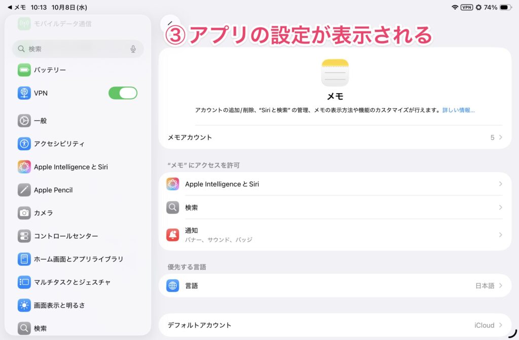 アプリの設定を呼び出す