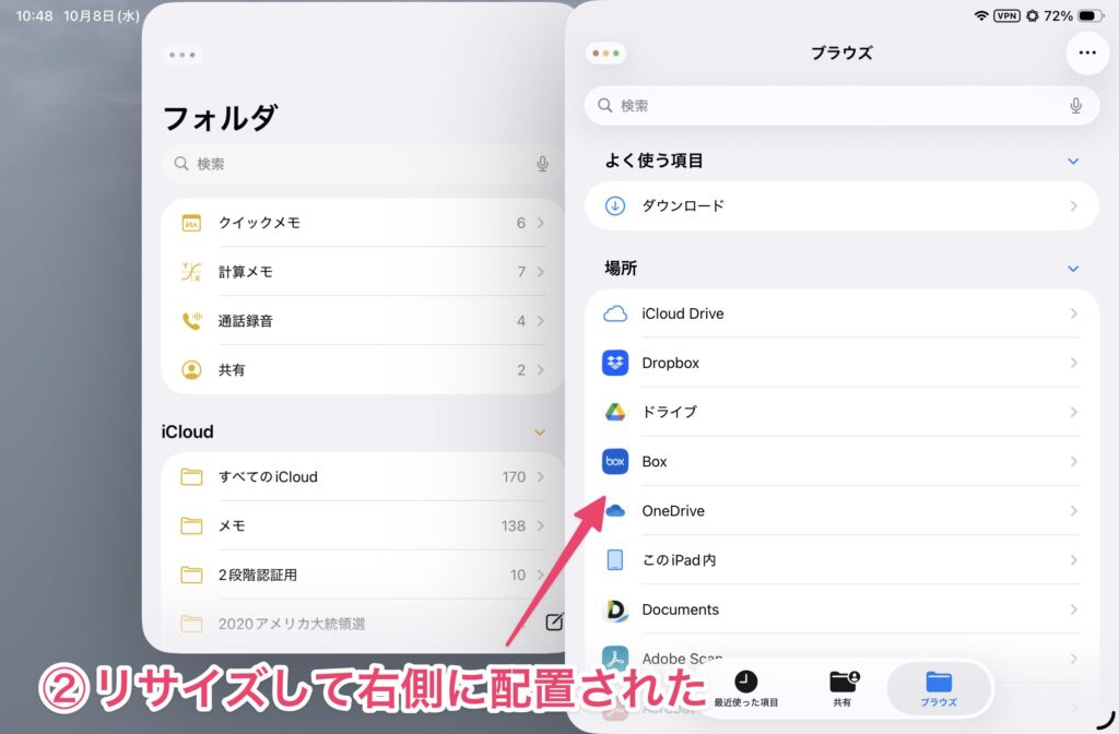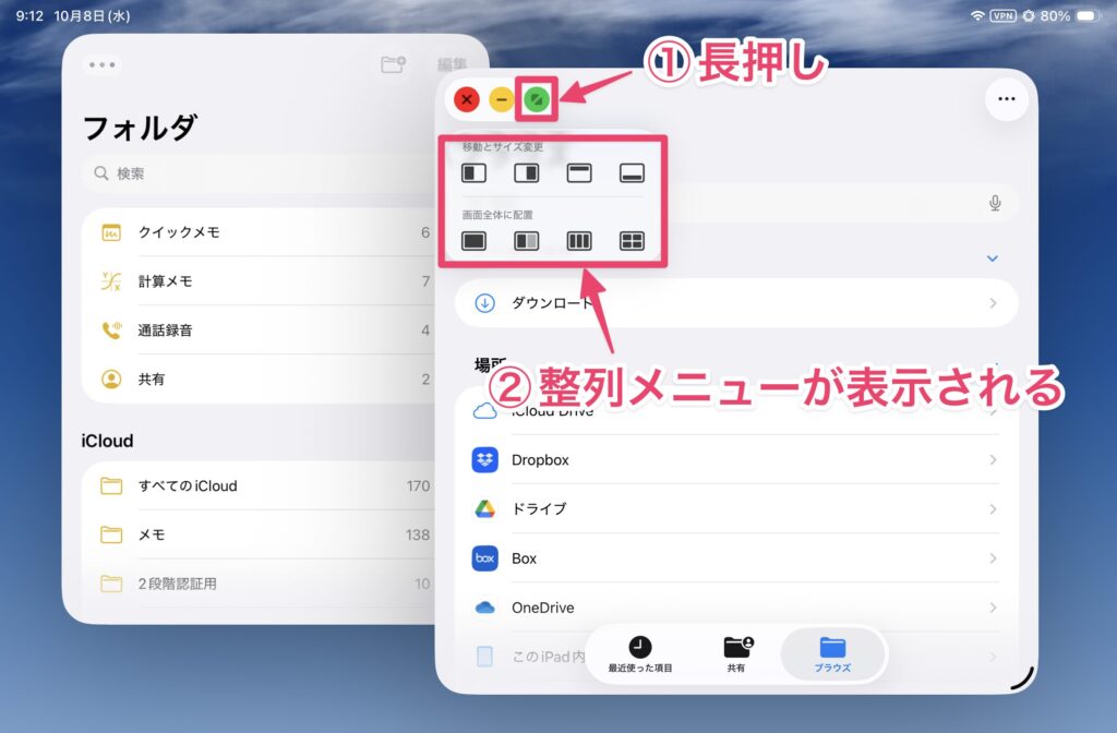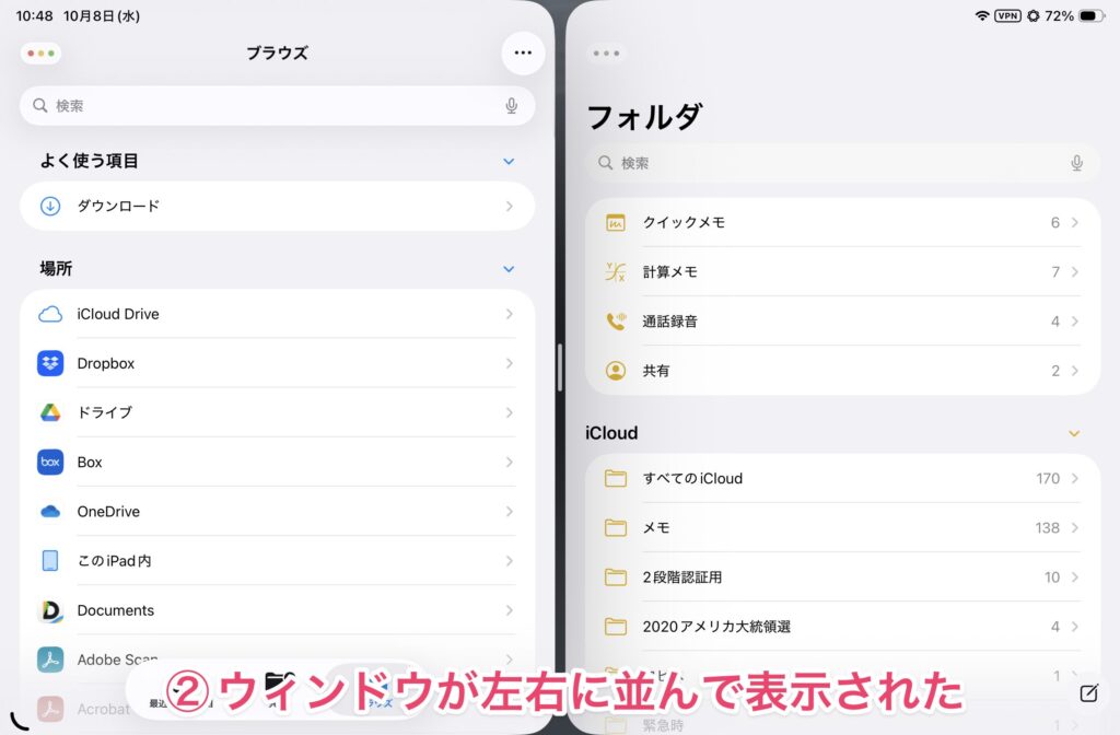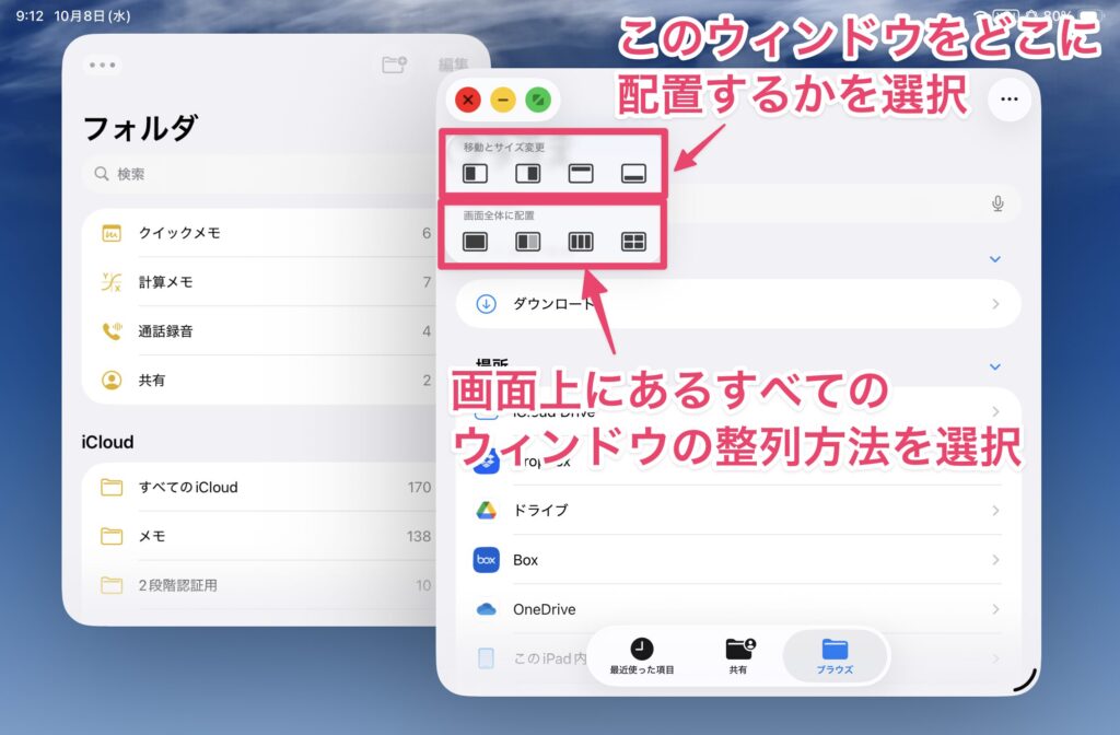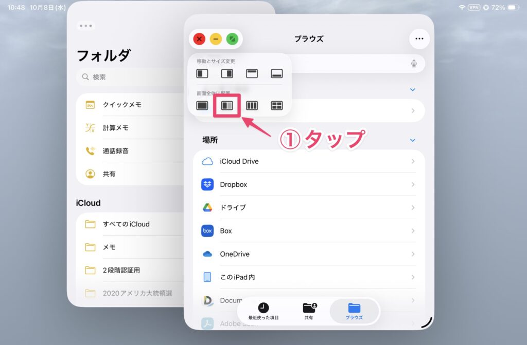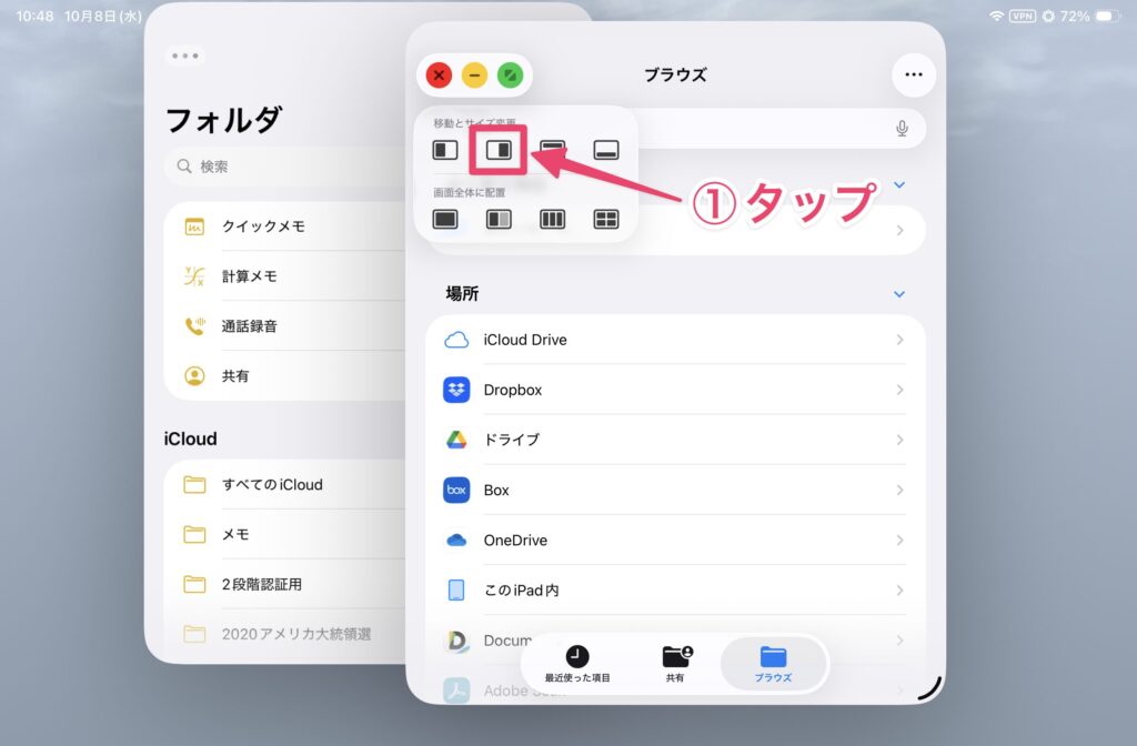 以前のSplitViewのように使いたい場合は、下段のメニューを使います。例えば、2つのウィンドウを横に並べて表示させる場合は、下段の2分割のアイコンをタップします。これでSplitViewのような表示になります。