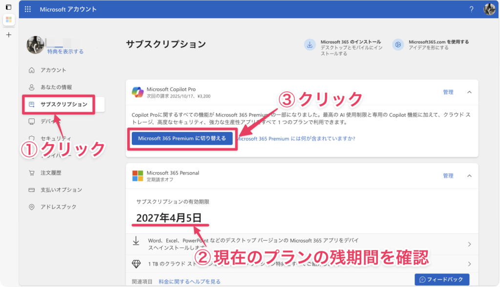 プランの変更はMicrosoftアカウントのページで行います。サインインしたら、「サブスクリプション」をクリックします。ここに現在契約しているプランが表示されます。Microsoft 365のセクションで現在の有効期限を確認しておきましょう。Copilot Proを契約している場合は、こちらのセクションに「Microsoft 365 Premiumに切り替える」というボタンがあると思うのでクリックします。