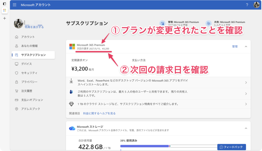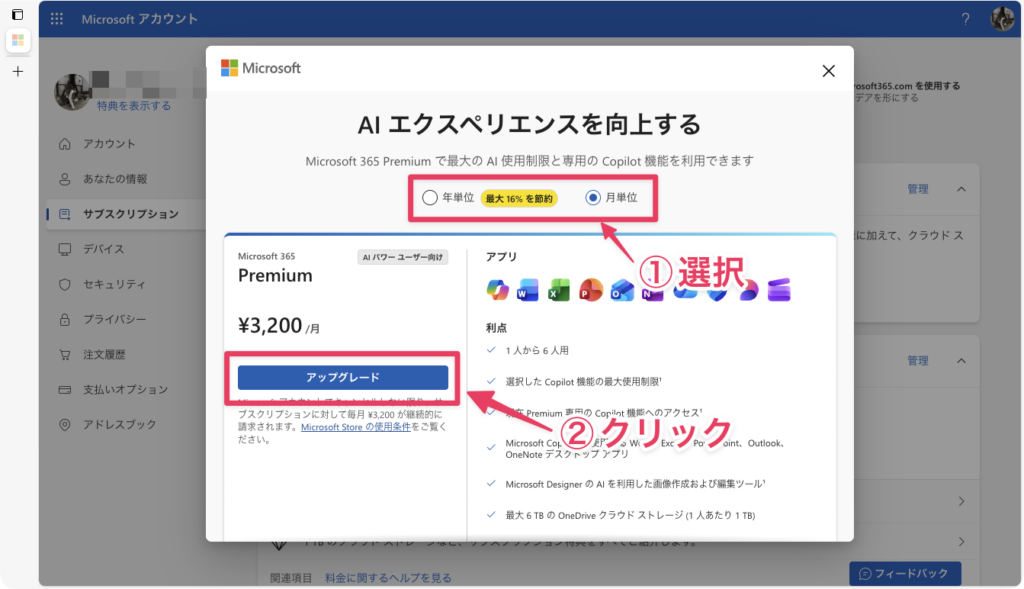 すでにMicrosoft 365 PersonalやFamilyを契約している場合、簡単にPremiumへアップグレードできます。アップグレードの手順は、Microsoftアカウントのサブスクリプション管理ページから数ステップで完了します。