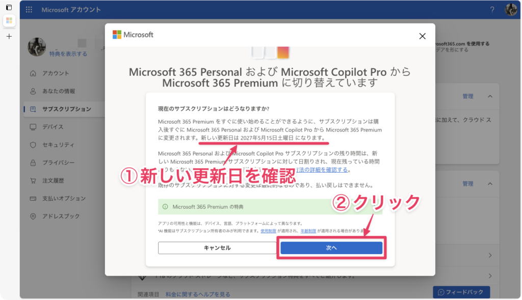 次の画面で新しい更新日が表示されます。Presonalプラン+Copilot Proの契約の場合、Personalプランの有効期間にCopilot Proの支払い済みの残期間を合算したものが表示されるようです。多分大丈夫だと思いますが、この更新日がおかしいと思ったら、この段階で操作を中断してマイクロソフトに問い合わせしたほうが良いでしょう。問題なければ「次へ」をクリックします。