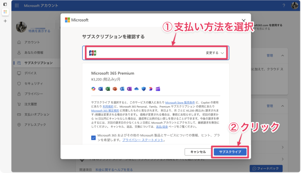 支払い方法の選択が表示されるので、支払い方法を選択します。もし支払い方法が登録していない場合は、ここで登録を求められると思うので画面の指示に従って登録してください。選択できたら「サブスクライブ」をクリックします。