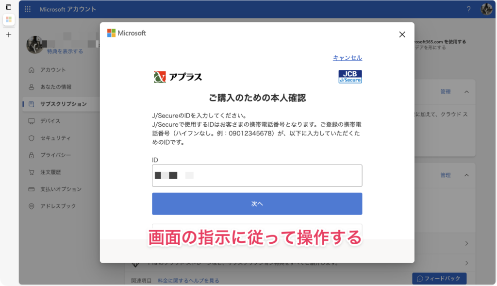 次の画面のように、選択した支払い方法に応じて本人確認などが求められます。画面の指示に従って操作してください。
