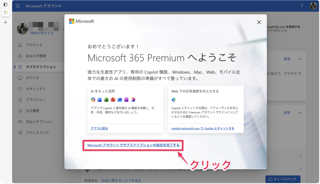 支払いに関する手続きが終わると、次の画面が表示されます。これで切り替えが完了です。「Microsoft アカウントでサブスクリプションの設定を完了する」をクリックします。
