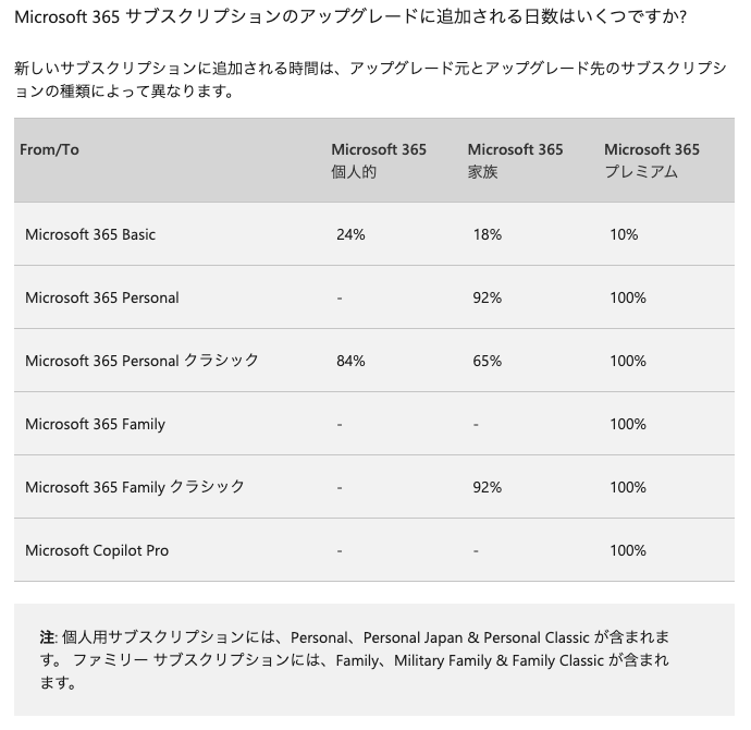 つまり、Microsoftのプラン変更では基本的に既存サブスクリプションの残り期間が新しいサブスクリプションに自動変換されるようです。