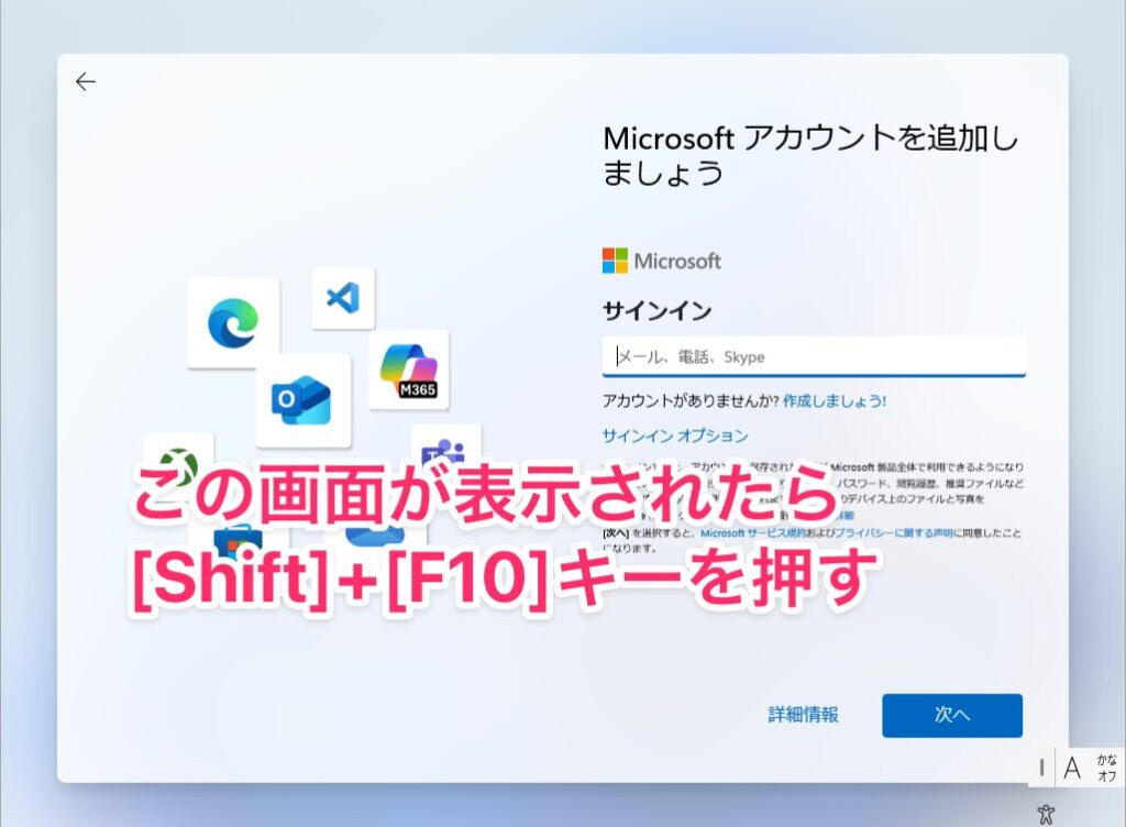 Windows 11のセットアップを進めていき、Microsoftアカウントのサインイン画面まで来たら、Shift + F10 キーを同時に押します。