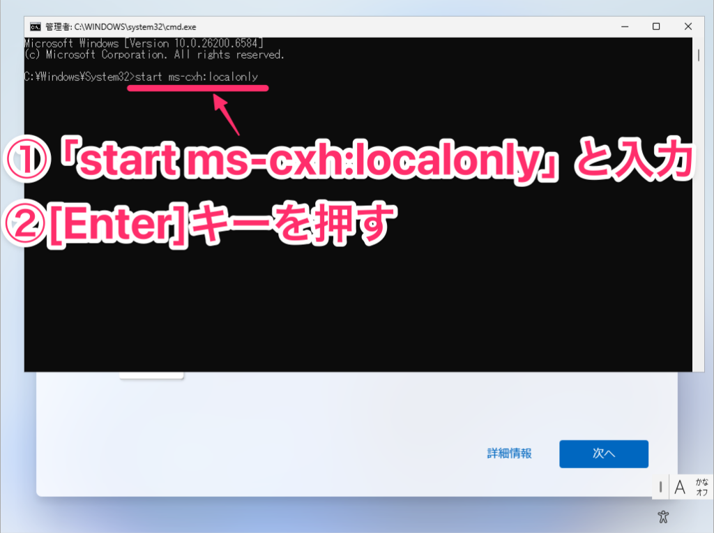 初期の頃は、セットアップ中にネットワーク接続を切断するだけでローカルアカウント作成画面に進めました。その後、コマンドプロンプトから「oobe\bypassnro.cmd」というコマンドを実行することで回避できる時期もありましたね。また、「start ms-cxh:localonly」というコマンドを使う方法も広く知られるようになりました。