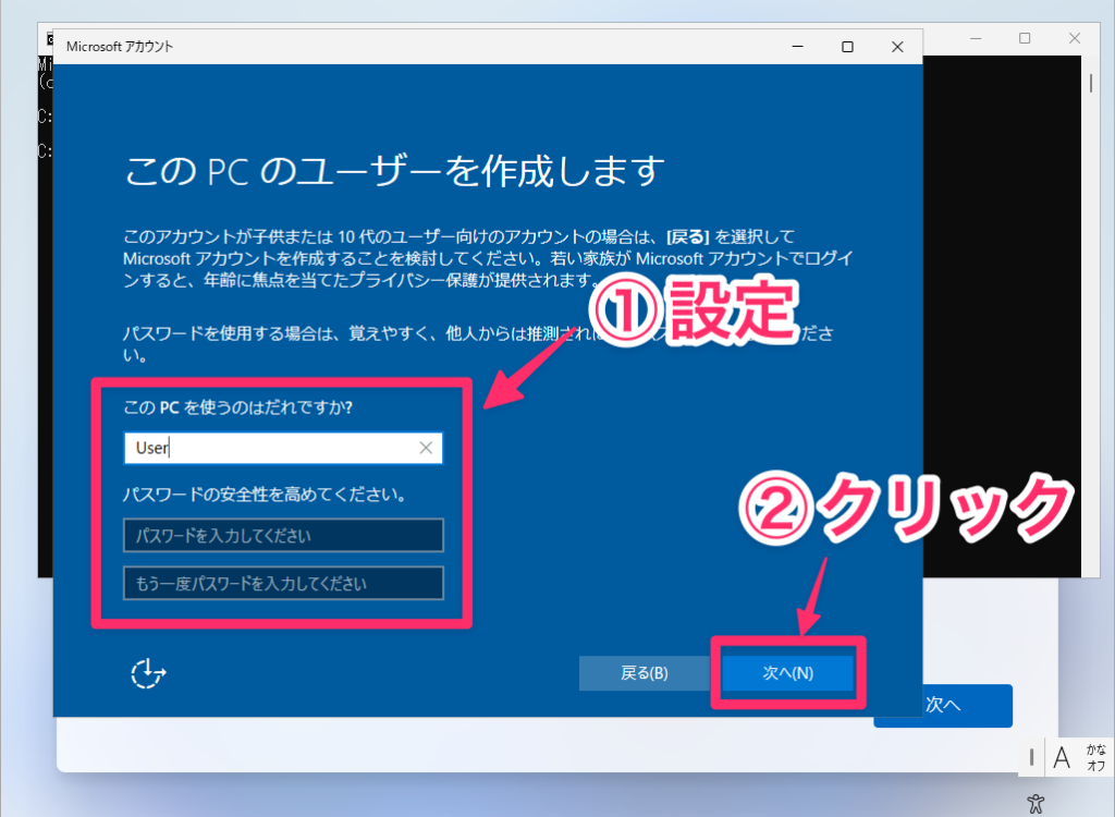 するとすぐに、ローカルアカウント作成画面が表示されるので、ユーザー名と必要に応じてパスワードを設定し、「次へ」をクリックします。