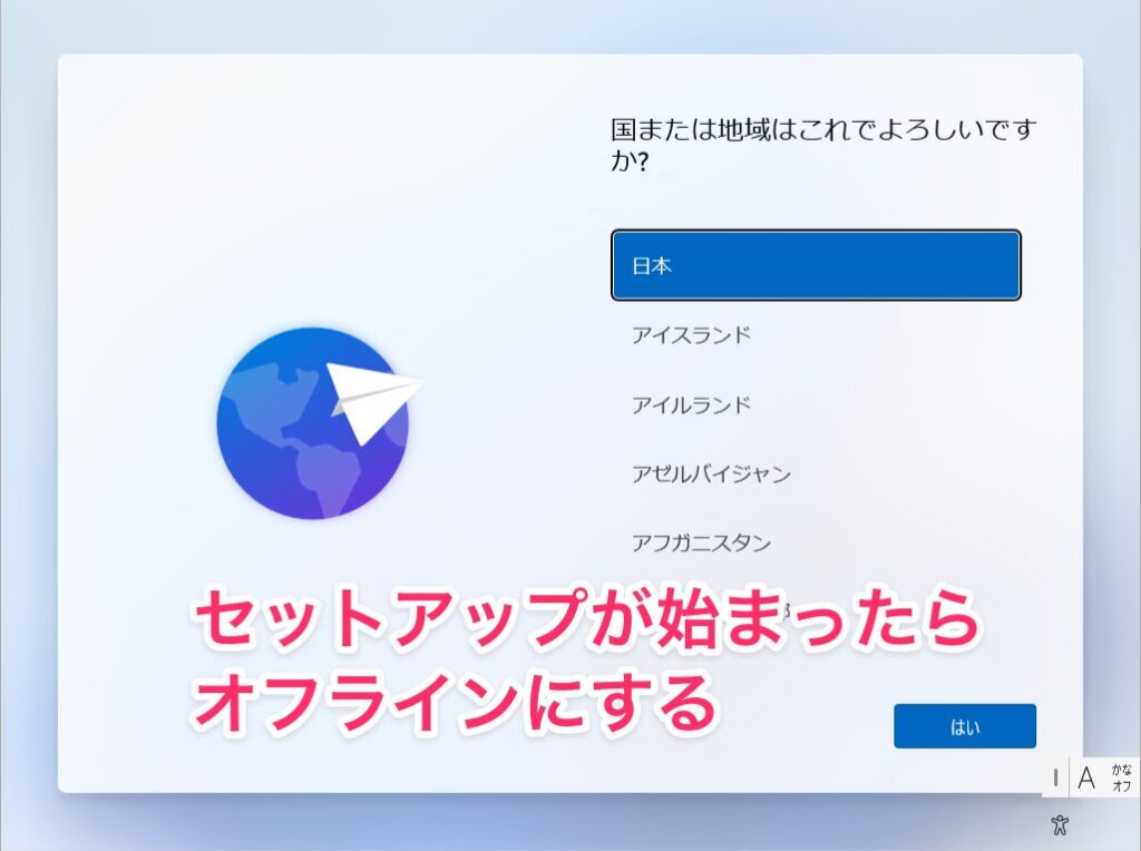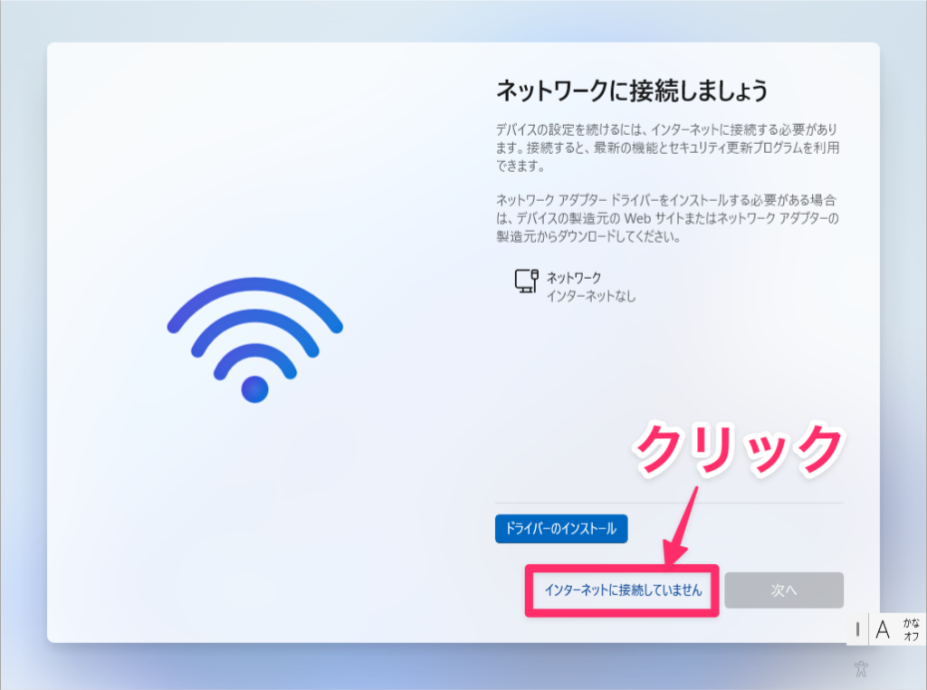 Windows 11のセットアップ画面が表示されたら、Wi-Fiをオフにするかネットワークケーブルを抜いてオフライン状態にします。