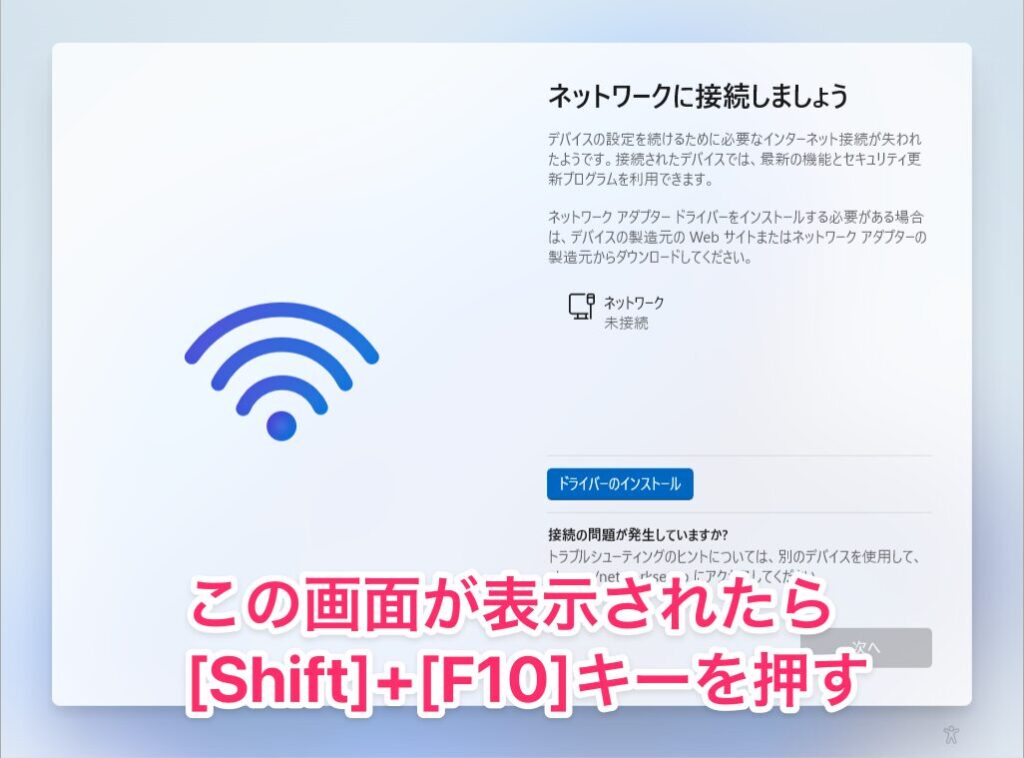 オフラインのままセットアップを続けると、「ネットワークに接続しましょう」の画面が表示されるので、、Shift + F10 キーを同時に押します。