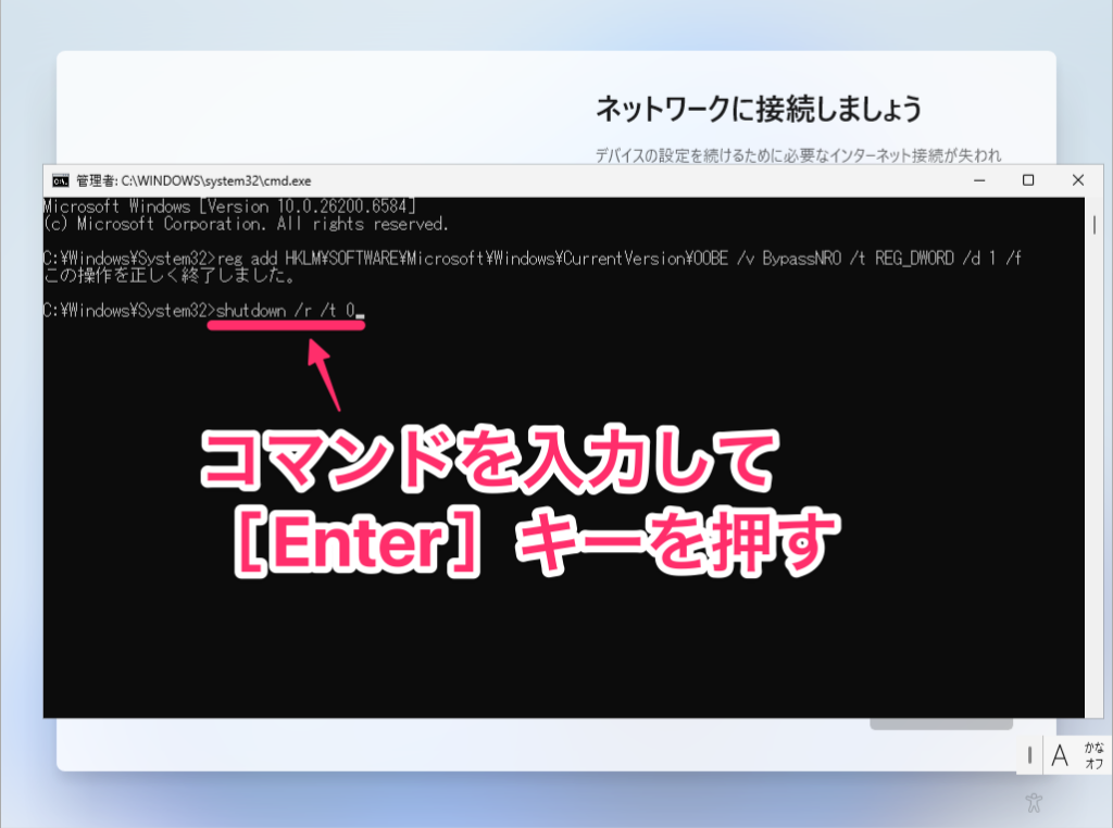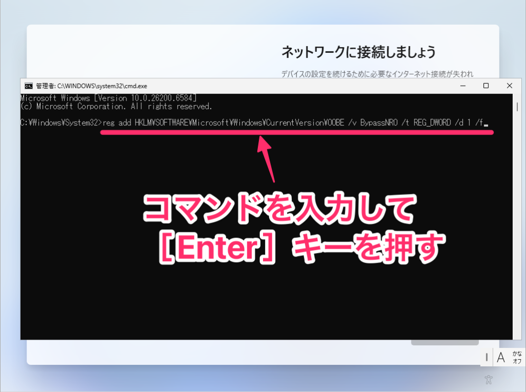 コマンドプロンプトが起動したら、次のコマンドをそのまま入力してEnterキーを押します。