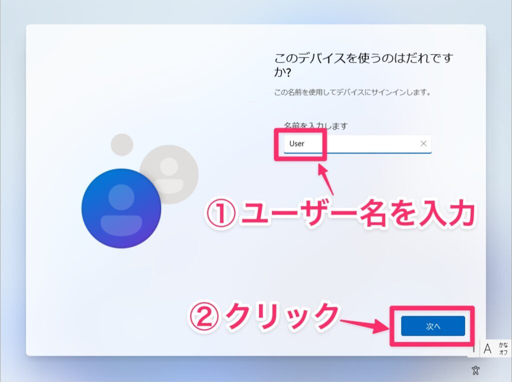 ローカルアカウントのユーザー名入力画面が表示されるので、ユーザー名を入力して「次へ」をクリックします。