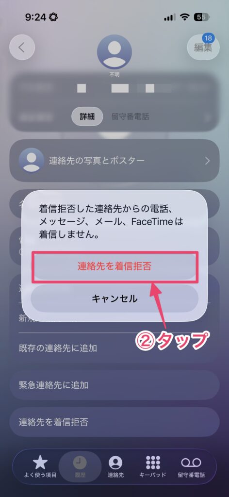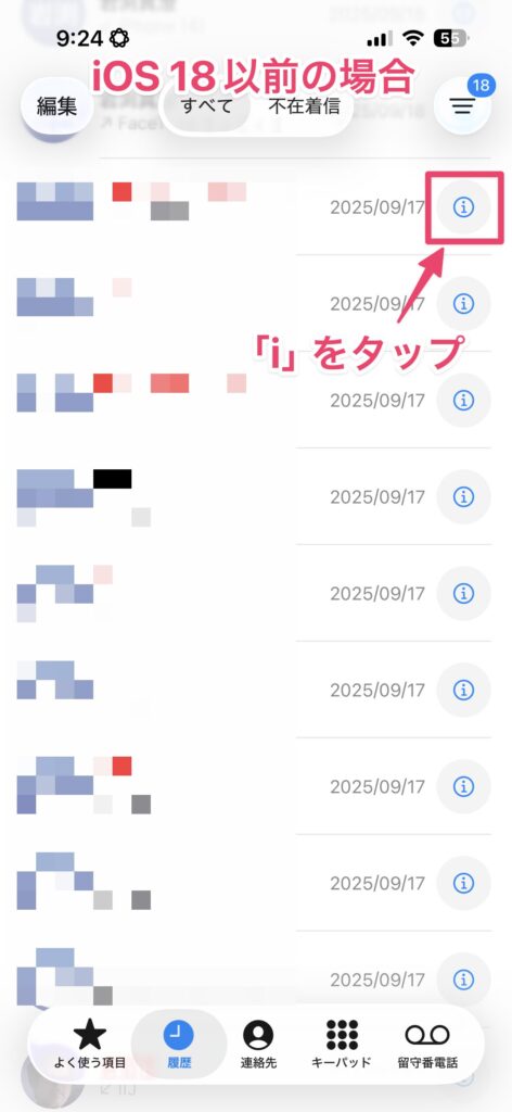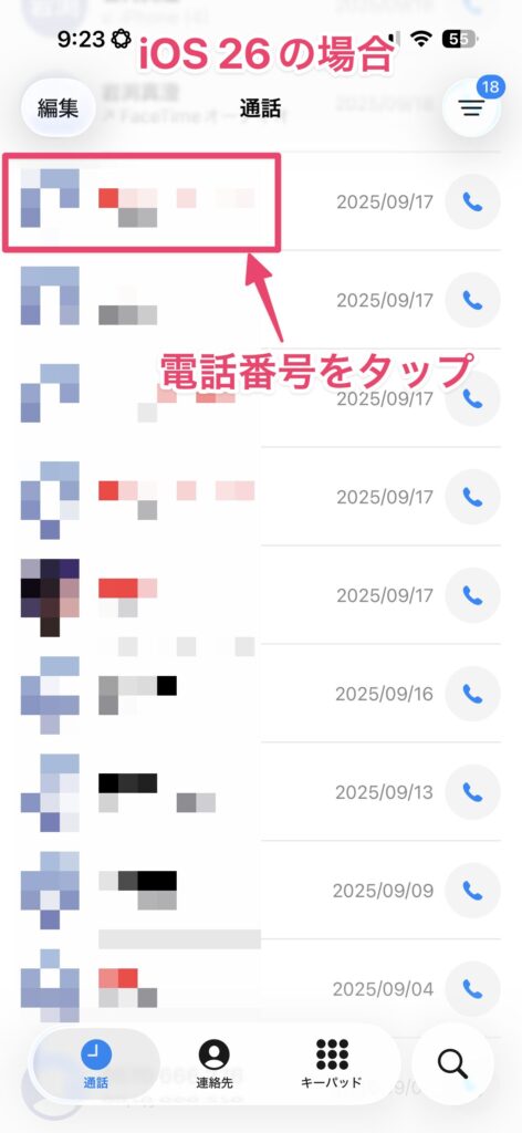 iPhoneの場合、電話アプリの着信履歴を開きます。iOS 26の場合はその電話番号をタップ、iOS 18の場合は「ⓘ」マークをタップします。