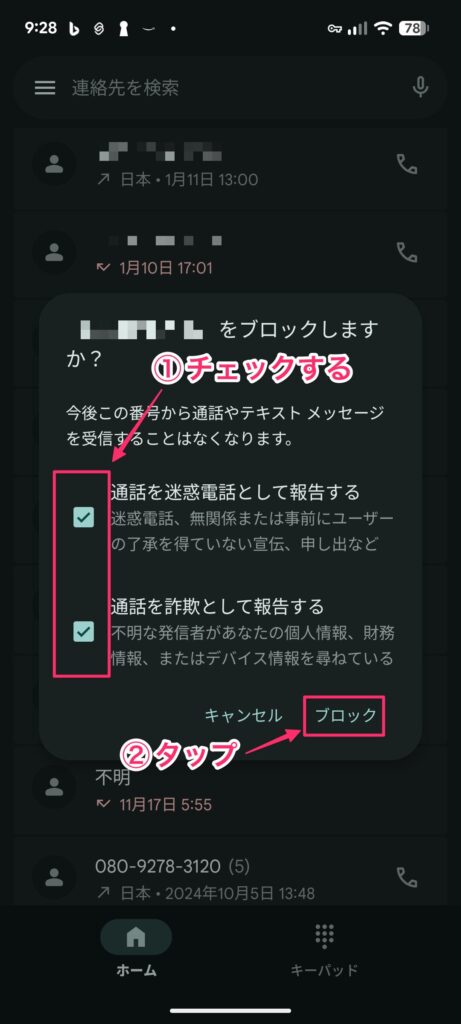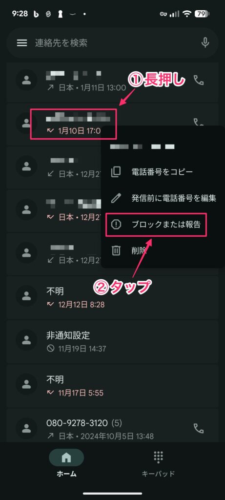 電話アプリの着信履歴でブロックする番号を長押しします。表示されたメニューの「ブロックまたは報告」をタップします。ブロックの確認メッセージが表示されるので、両方にチェックを付けて「ブロック」をタップします。詐欺報告に関するメッセージが表示されたら、画面の指示に従って報告してください。これでブロックは完了です。