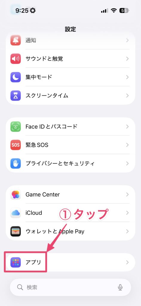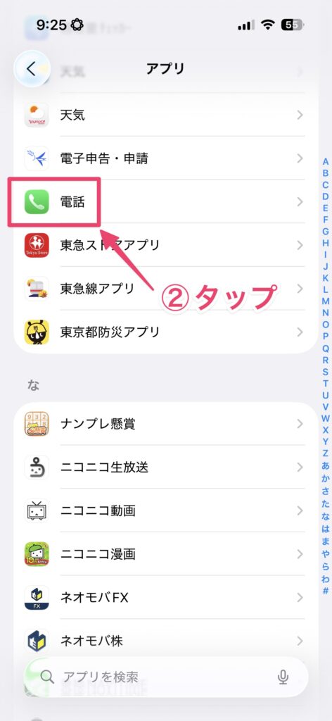 設定アプリを開いたら、一番下にある「アプリ」をタップします。アプリ一覧が表示されるので「電話」を開き、「不明な発信者を消音」をオンにします。
