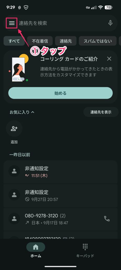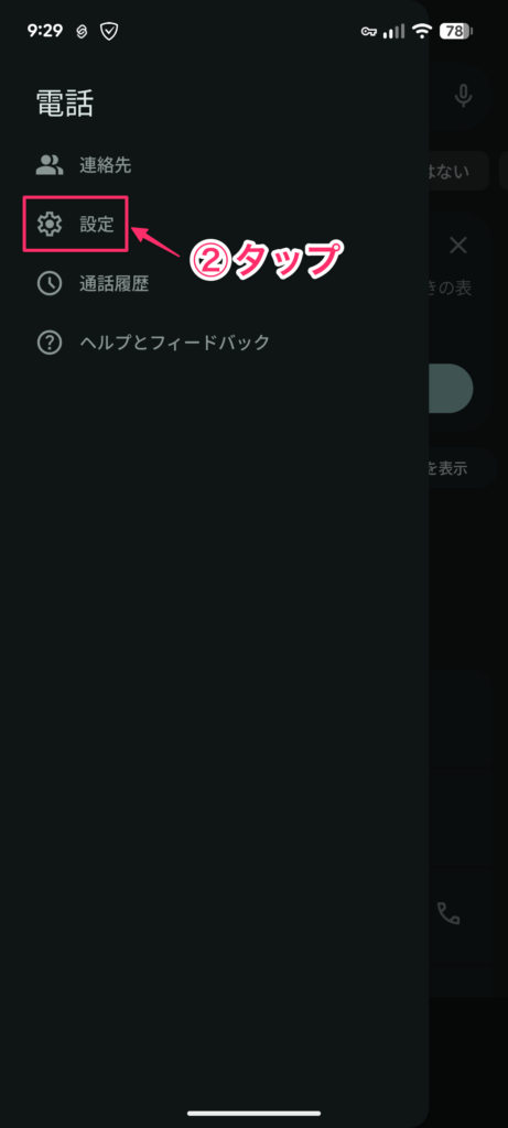 この機能を使いには、電話アプリの左上にある「≡」をタップします。メニューが表示されるので、「設定」をタップします。
