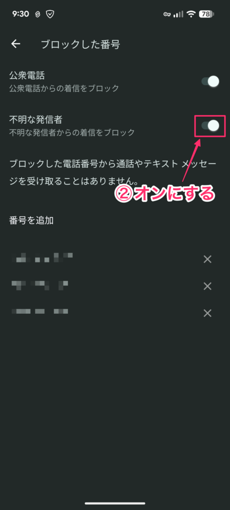 設定画面が表示されるので「ブロック中の電話番号」をタップし、「不明な発信者」をオンにします。